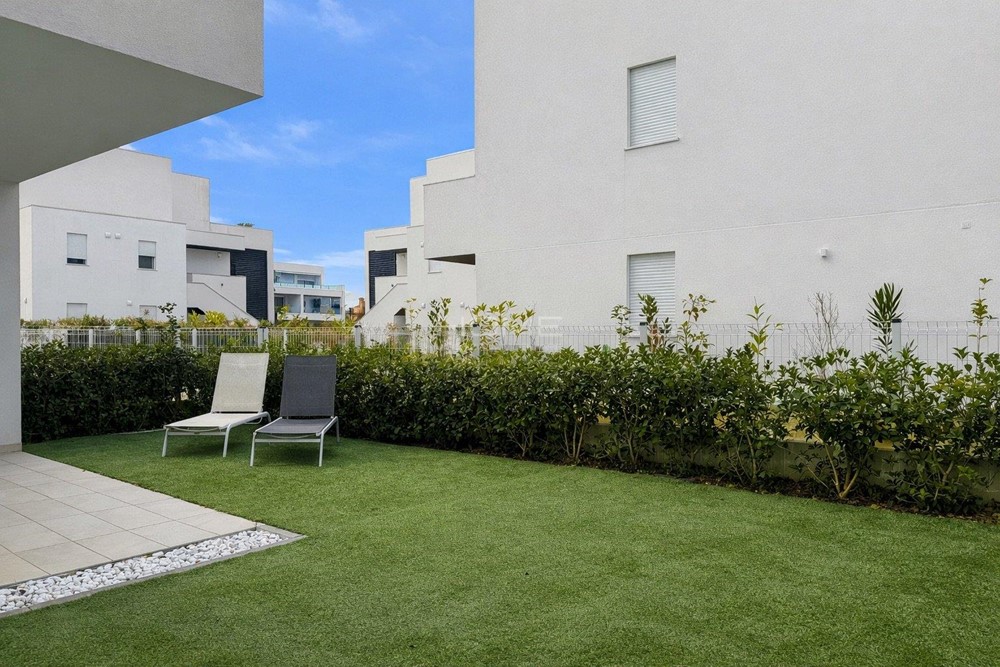 Erdgeschosswohnung in einer Wohnanlage mit Swimmingpool, gelegen in einer ruhigen und dennoch zentralen Lage. Die Wohnung besteht aus einem Wohnzimmer mit Kochnische, 2 Bädern und 2 Schlafzimmern sowie einem privaten Außenbereich. Klimaanlage, Waschmaschine, Geschirrspüler und Parkplatz sind inklusive. Pool service verfügbar vom 01.06. bis 15.09
