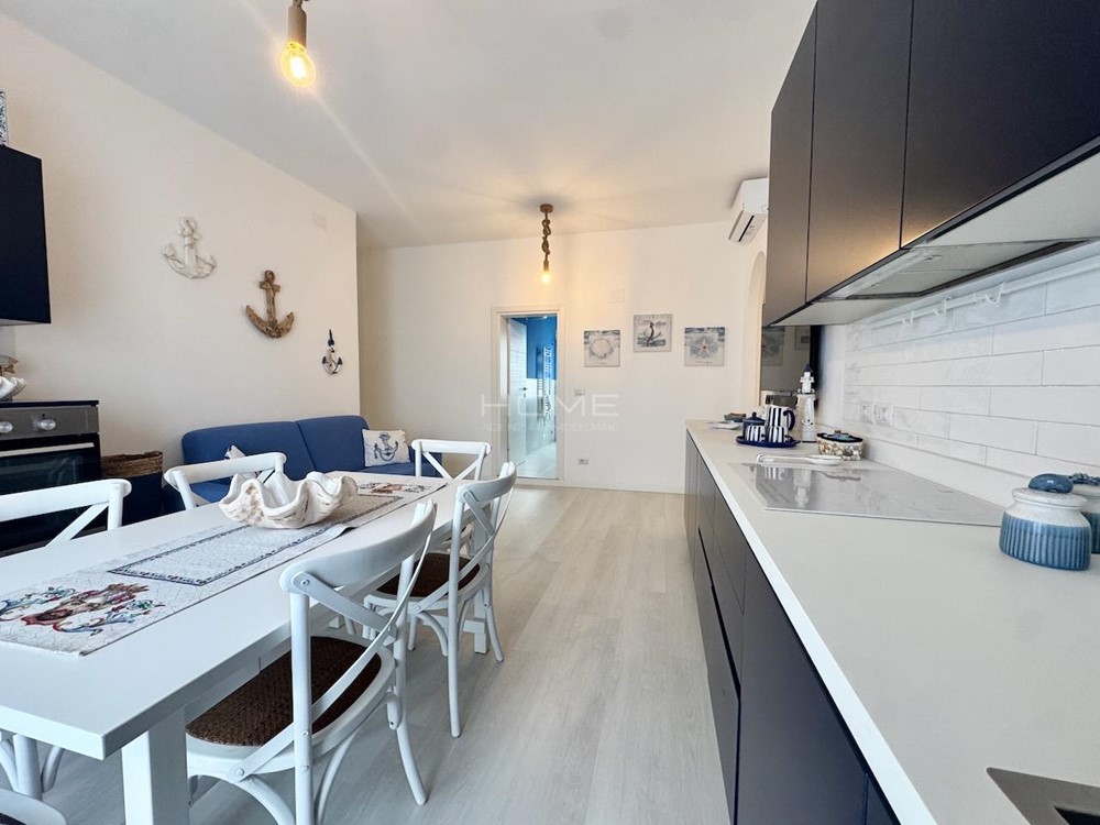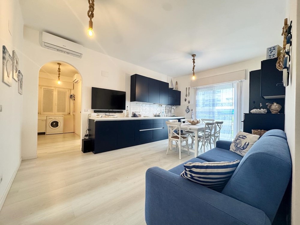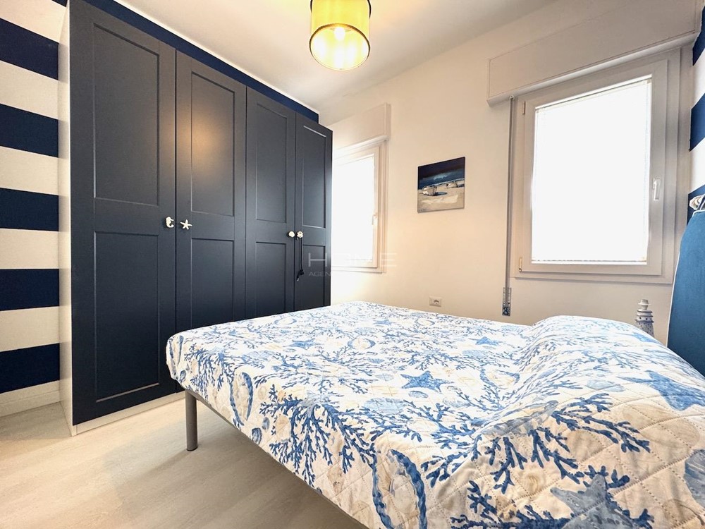 Entrance with security door opening onto a spacious and bright living room with kitchenette, terrace overlooking Via Bafile, first windowed bathroom with sanitary fixtures and shower box, first double bedroom, bedroom with bunk bed, third bedroom with double bed and en-suite bathroom with sanitary fixtures and shower box.