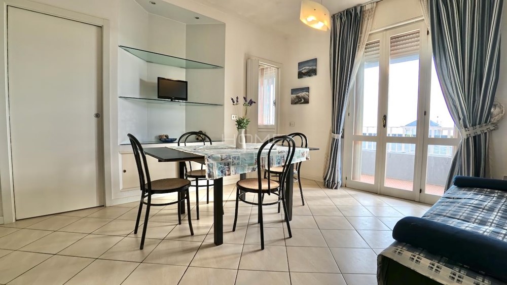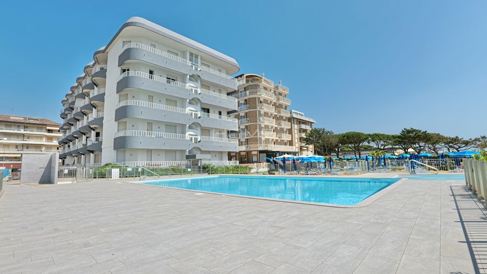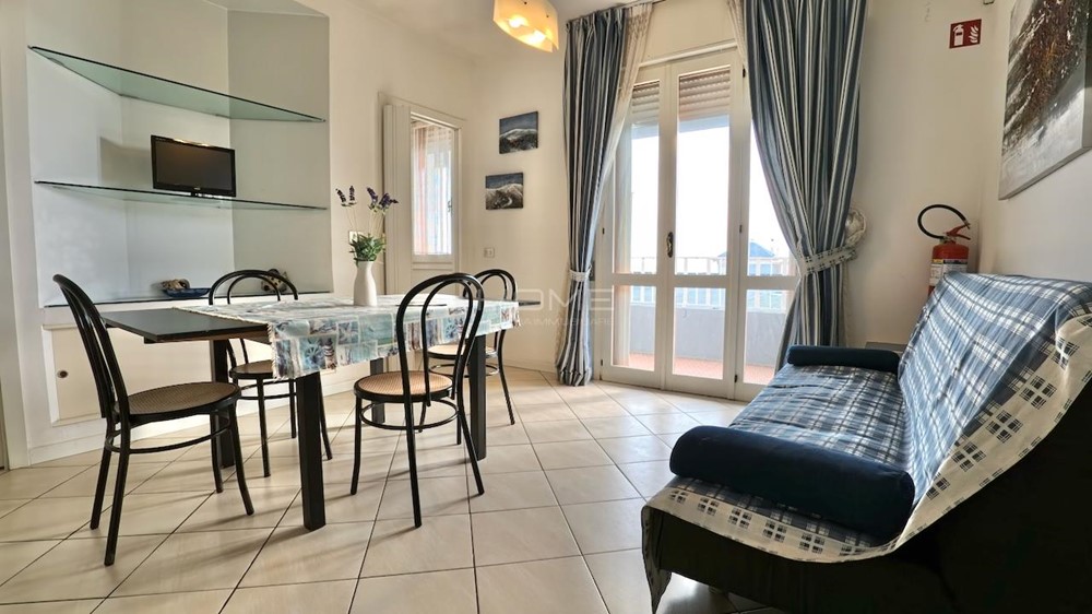Appartamento situato al primo piano, composto da un ingresso che conduce a un luminoso soggiorno con angolo cucina. Include una camera matrimoniale, una cameretta con letto a castello e un bagno completo di box doccia e sanitari. La terrazza offre una vista frontale sul mare, ideale per pranzare o cenare all'aperto. L’appartamento è dotato di aria condizionata e lavatrice. Sono inclusi l'accesso alla piscina condominiale, il servizio spiaggia con ombrellone e due lettini, e un posto auto ( di piccole dimensioni).
