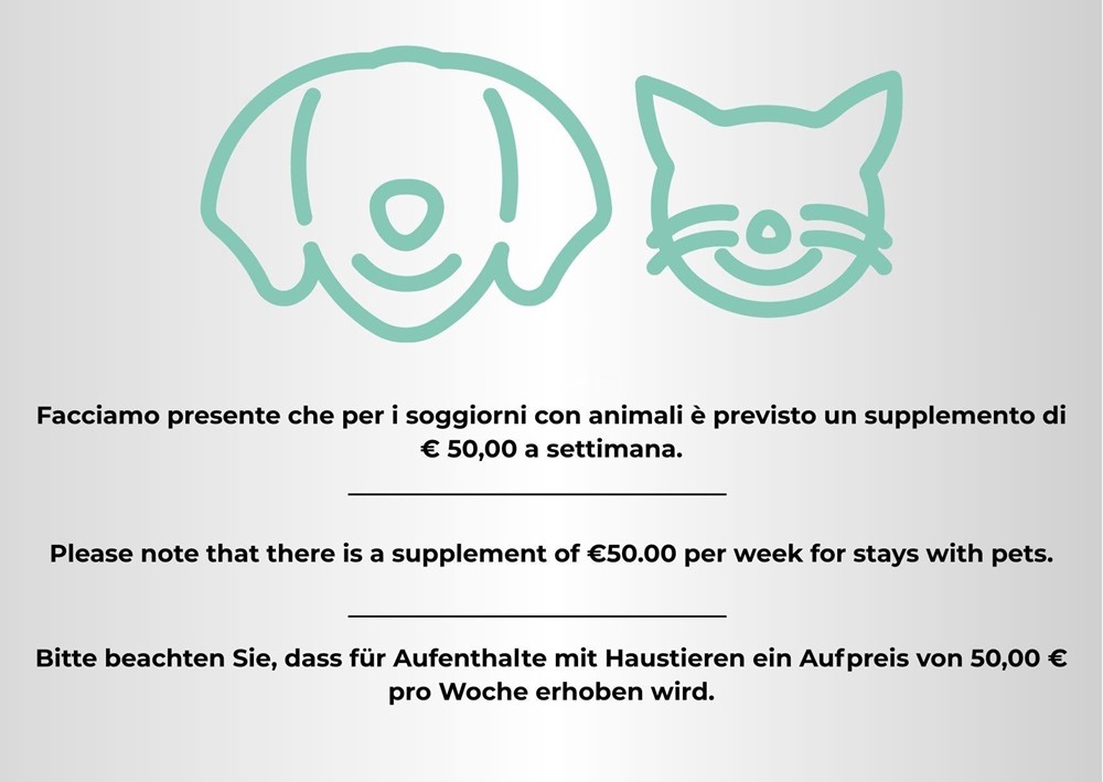 Facciamo presente che per i soggiorni con animali è previsto un supplemento di € 50,00 a settimana.