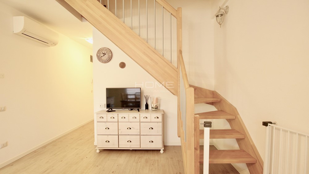 L'appartamento al piano primo si apre su un ingresso che conduce a un luminoso soggiorno dotato di un divano con zona cucina attrezzata con un piano induzione, forno e lavastoviglie e lavatrice, rendendola funzionale e pratica, inoltre troviamo anche un bagno finestrato completo di accessori. Nella zona notte al piano superiore, troviamo un bagno finestrato completo di box doccia e sanitari, insieme a una camera matrimoniale e una seconda camera matrimoniale. All'esterno due splendide terrazze abitabili, che offrono uno spazio ideale per pranzare o cenare all'aperto.