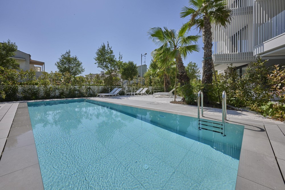 Inserito in un quartiere residenziale alle spalle di piazza Aurora a Jesolo lido vendiamo appartamenti in nuovo residence con piscina, composto da sole 12 unità al piano terra, primo o secondo, serviti da ascensore.