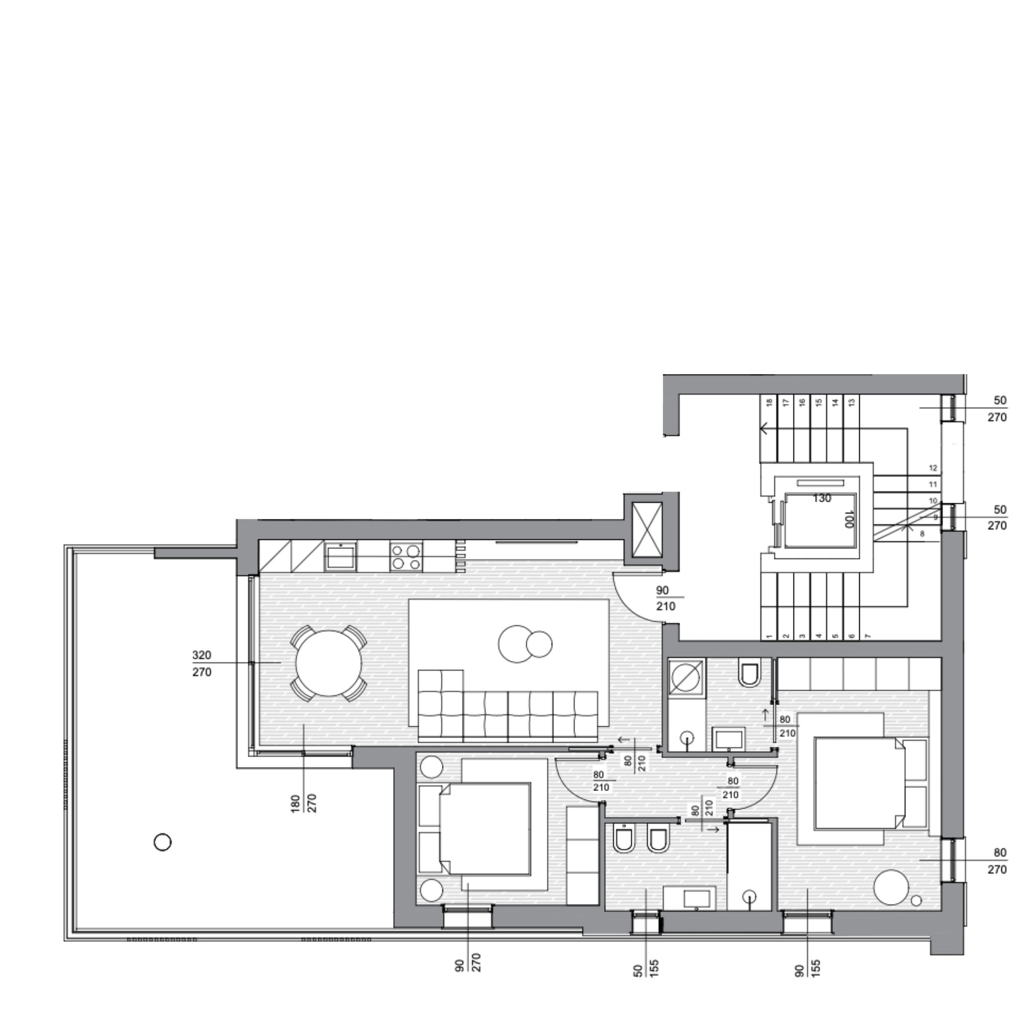 · Ottavo piano: esclusivo attico con generosissimo living-cottura, 3 camere e 3 bagni, ampie terrazze e massima privacy, pensato per chi desidera spazi ampi e un’abitazione di rappresentanza.