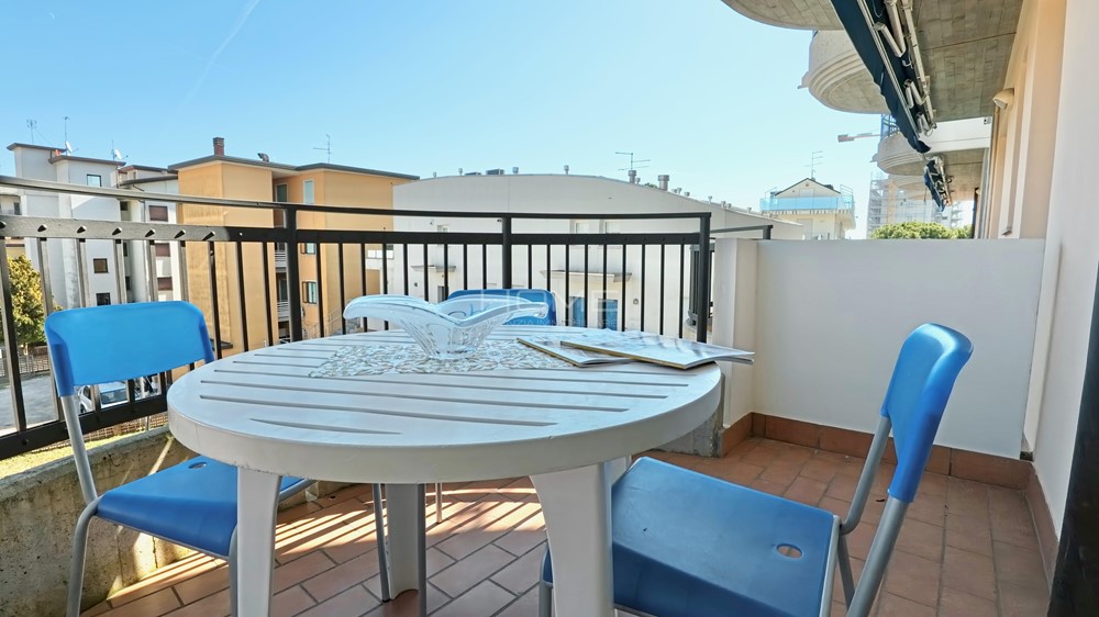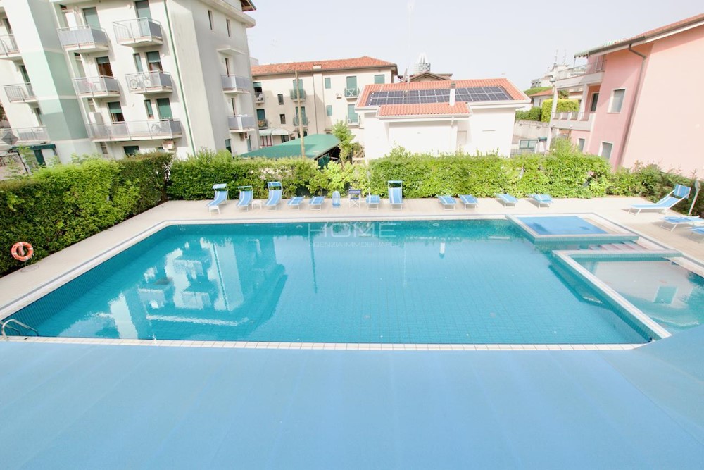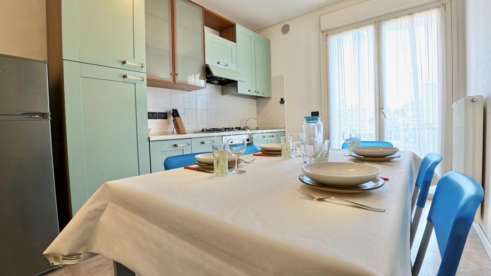 Appartamento al secondo piano con ascensore, composto da ingresso, soggiorno con angolo cottura e accesso a un ampio terrazzo, camera matrimoniale con terrazzo, seconda camera con letto a castello e letto estraibile, e bagno finestrato con doccia. Climatizzato, include posto auto coperto, piscina e servizio spiaggia con ombrellone e lettini.