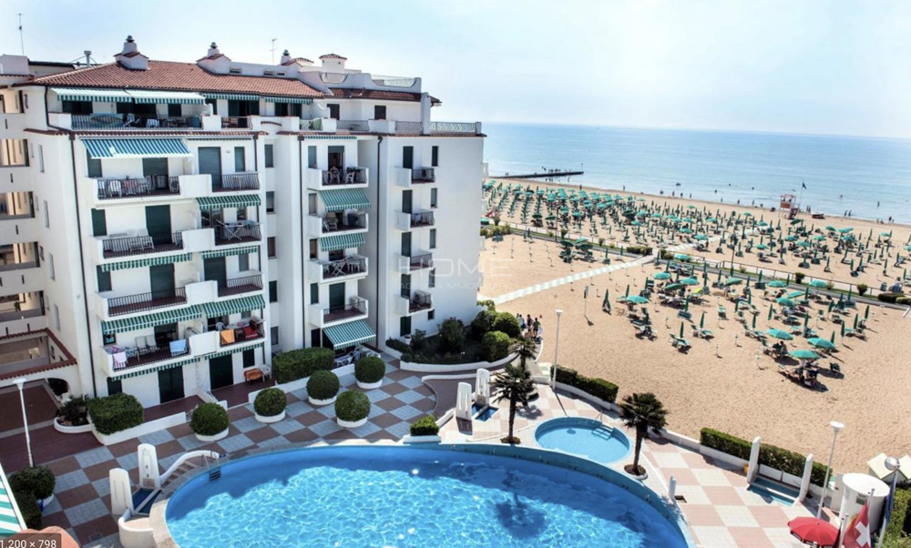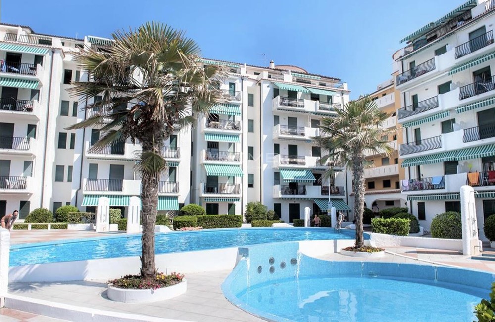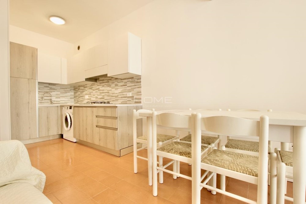 Appartamento al terzo piano con ascensore, lato mare, composto da un luminoso soggiorno con divano e angolo cottura, una camera matrimoniale e una camera doppia con due letti singoli. Il bagno (cieco) è dotato di box doccia e sanitari. La terrazza offre una vista mare laterale, ideale per pranzare o cenare all'aperto. L'appartamento è dotato di aria condizionata, lavatrice e un posto auto libero (non garantito). Inclusi anche l'accesso alla piscina e solarium, oltre al servizio spiaggia con ombrellone e due lettini o sdraio.